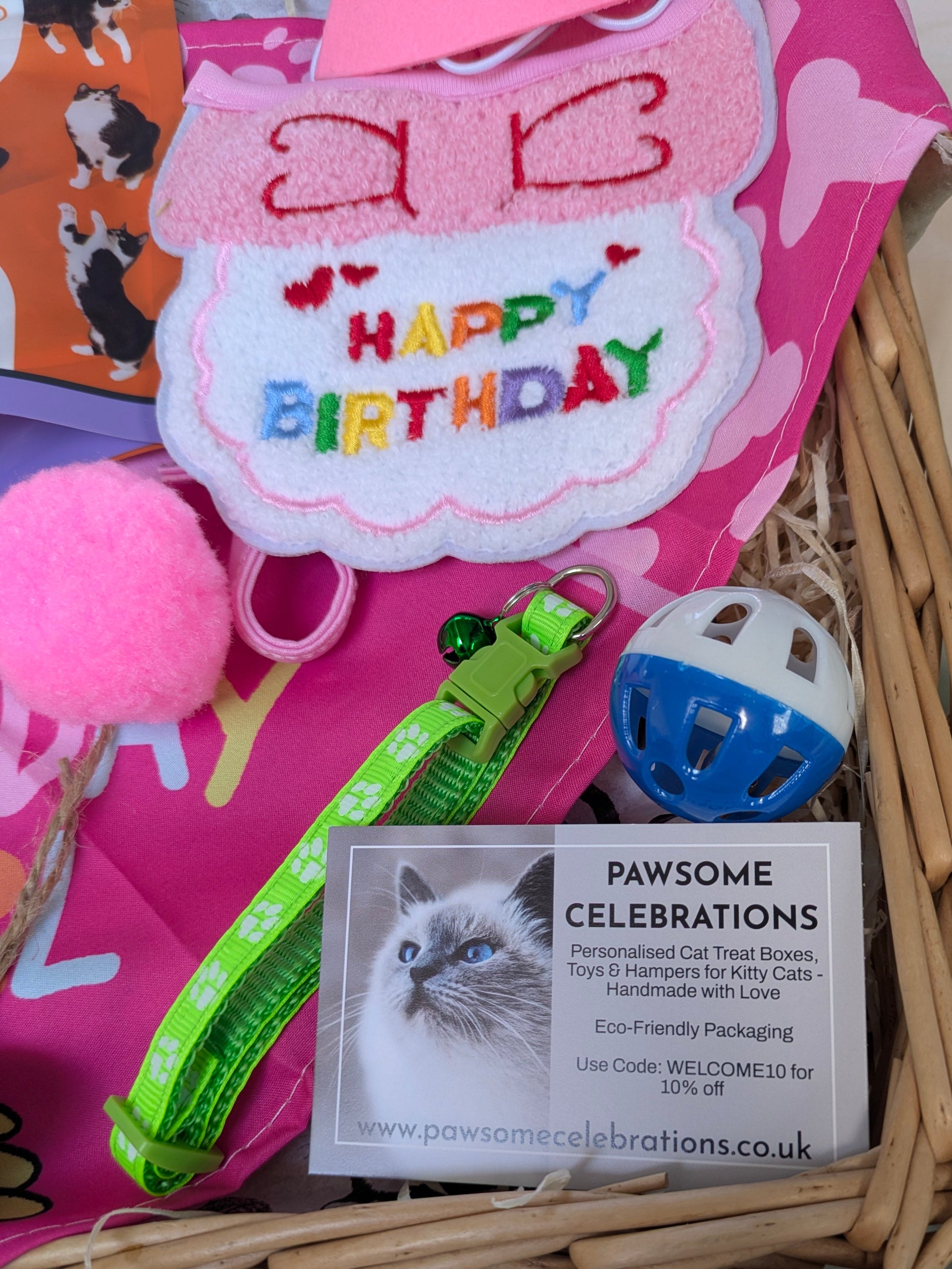 Make your cat's birthday unforgettable with our handcrafted luxury gift box, lovingly curated with premium treats and engaging toys. Each personalised hamper is designed to bring pure joy and excitement to your feline friend's special celebration.